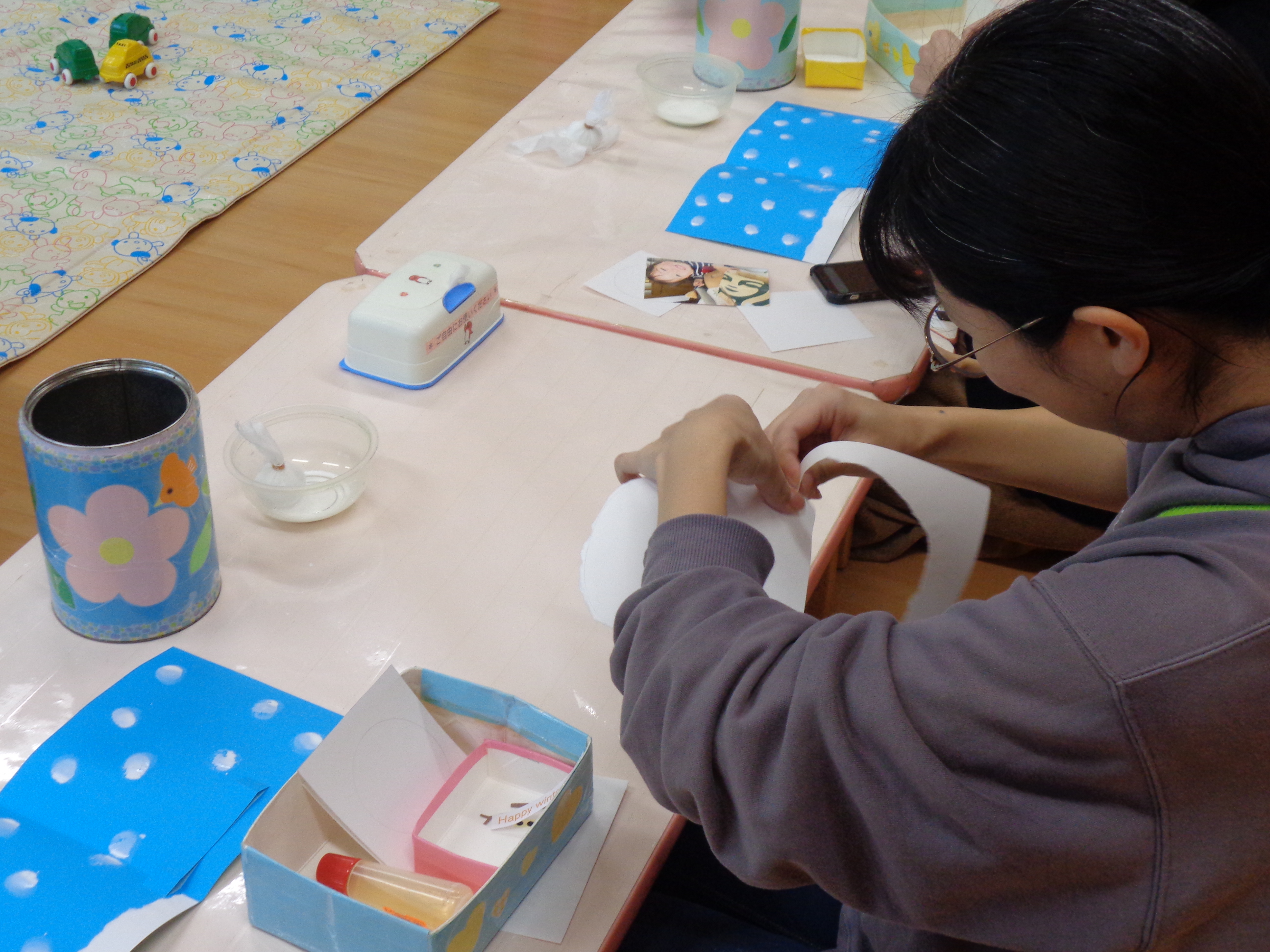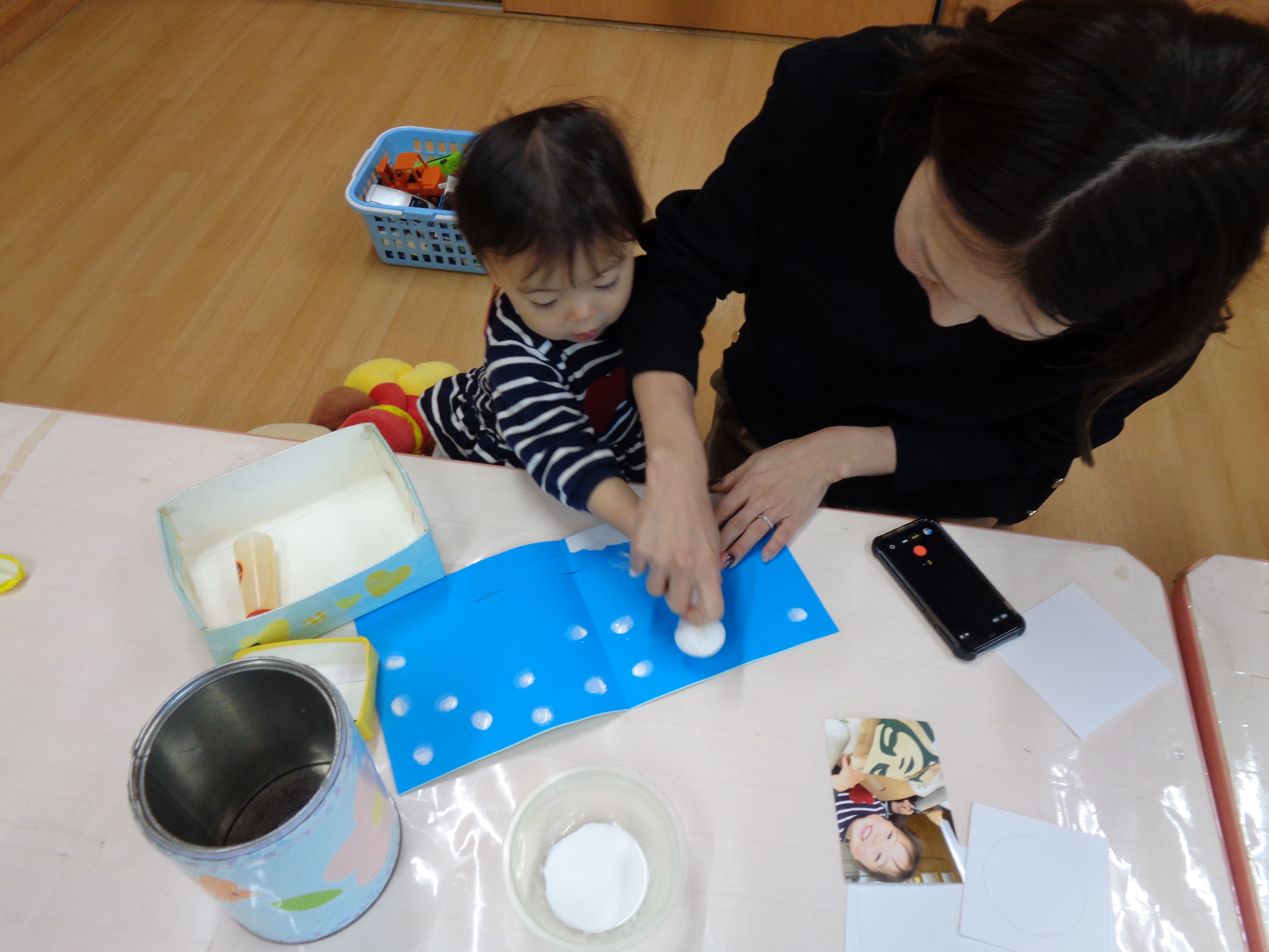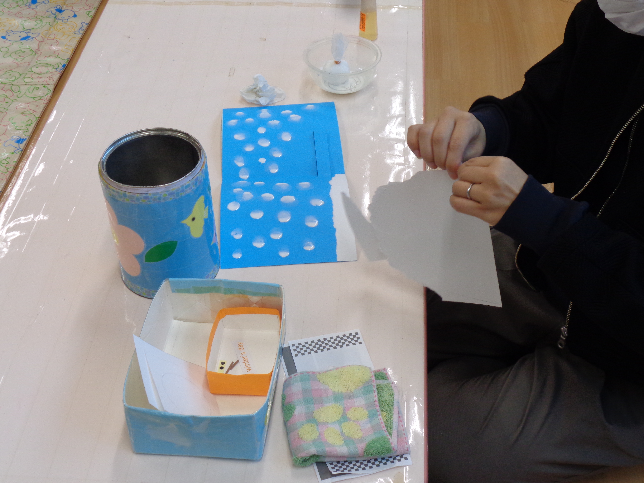 お子さんと一緒に、たんぽ筆でカードに雪の模様をつけていきます。