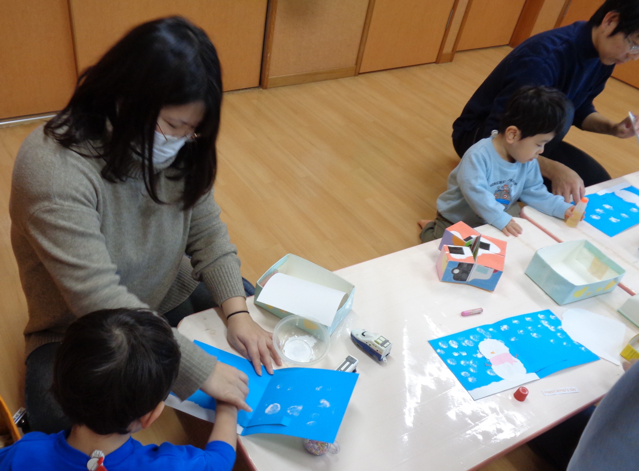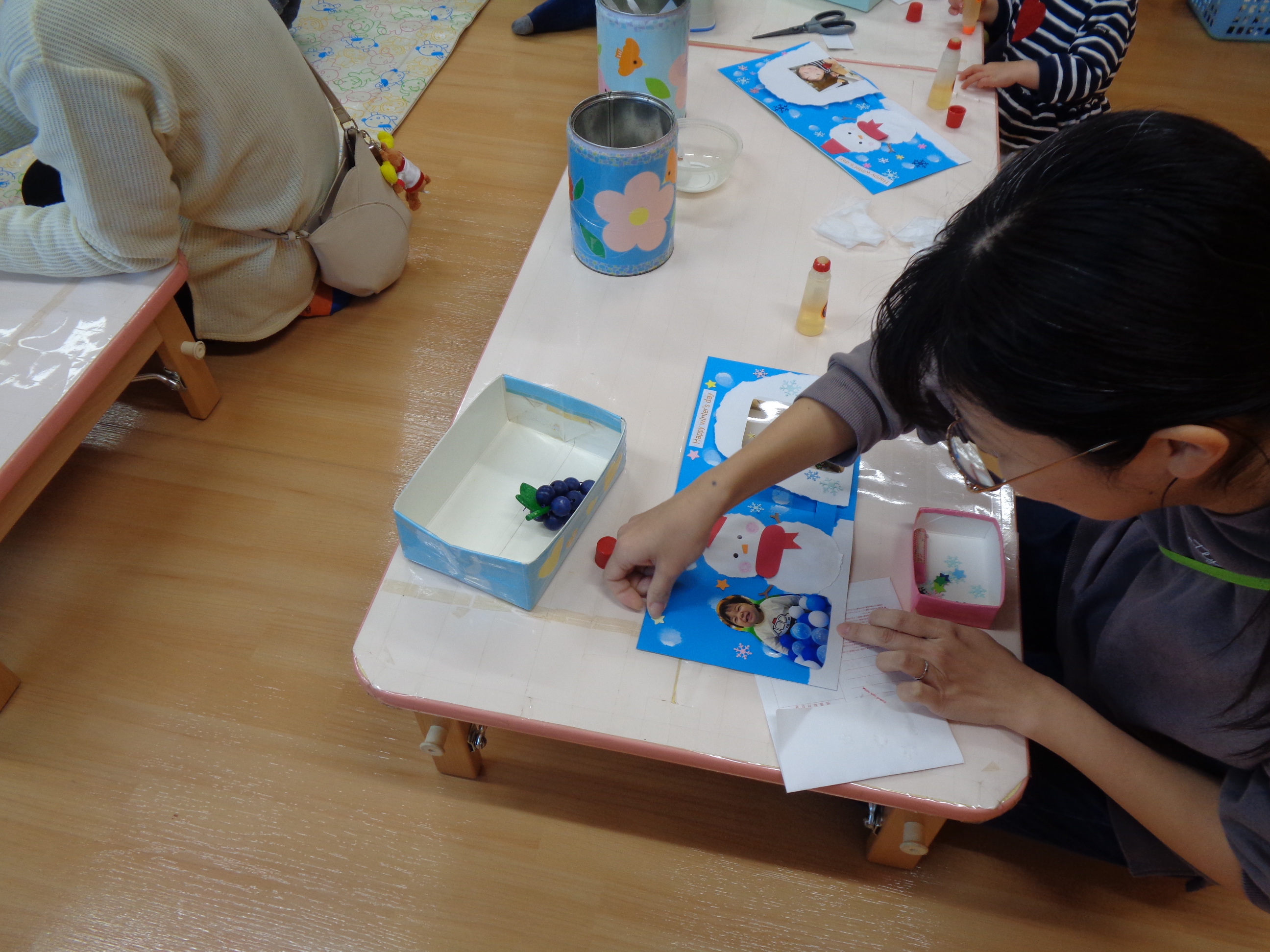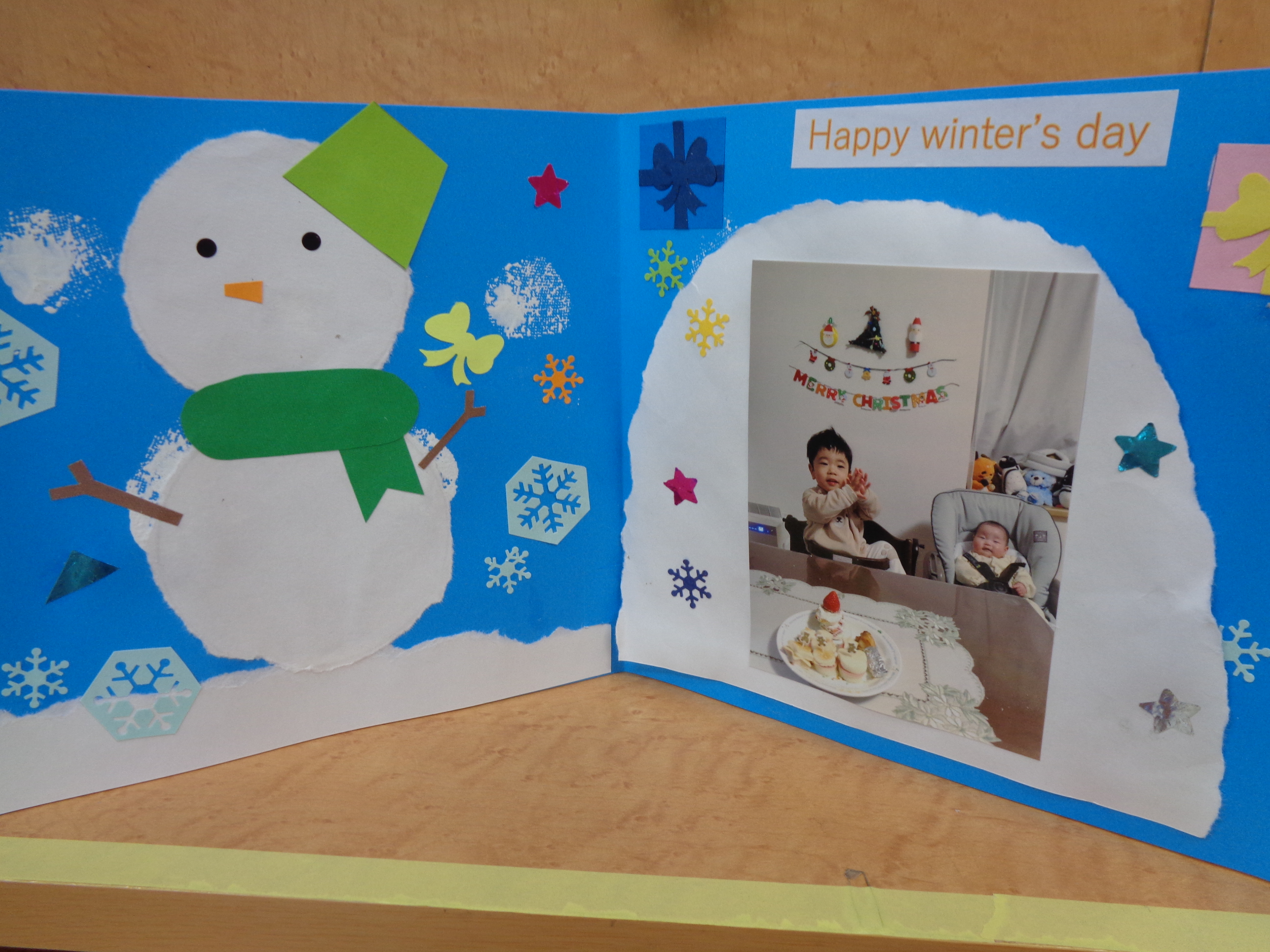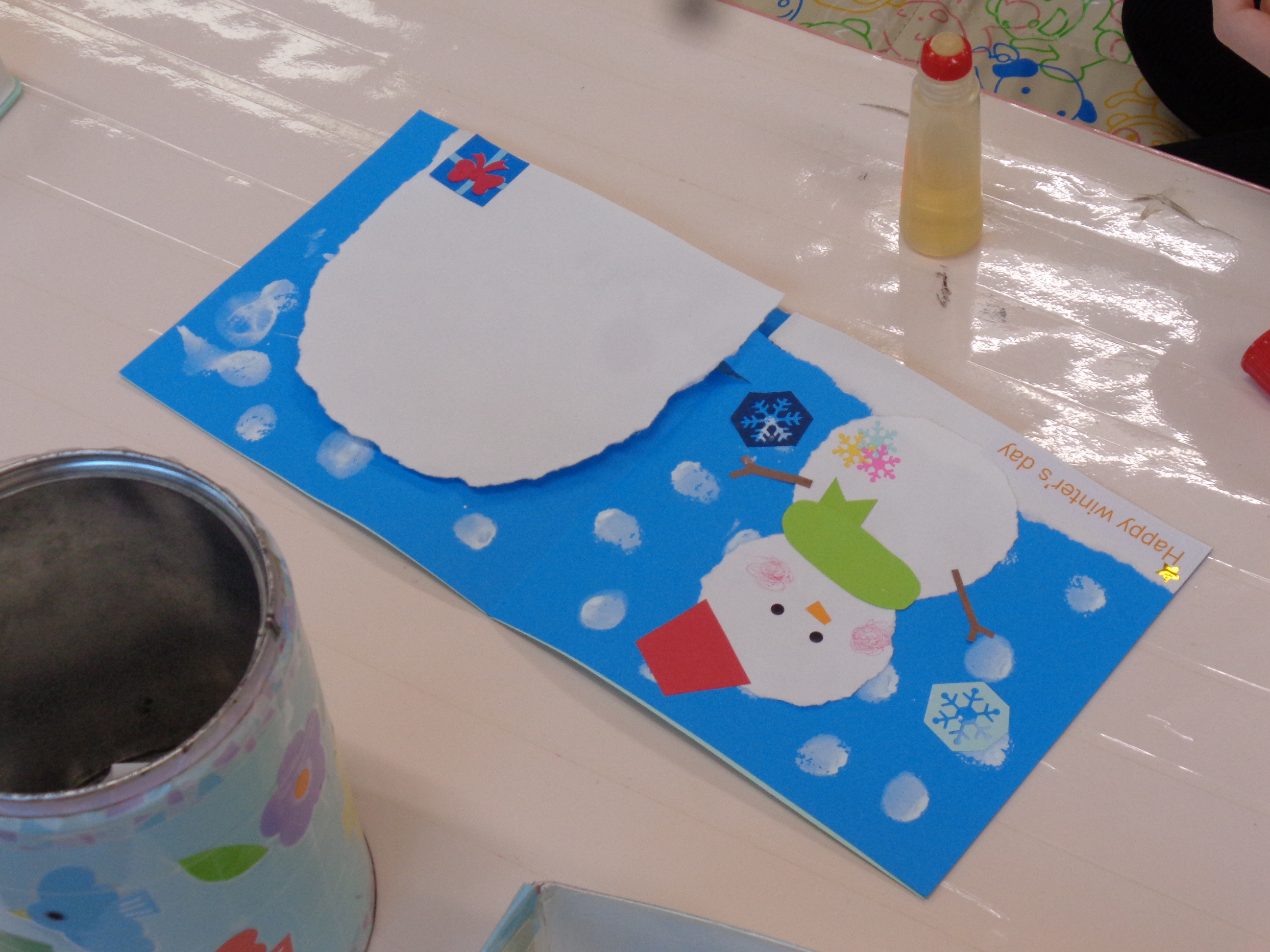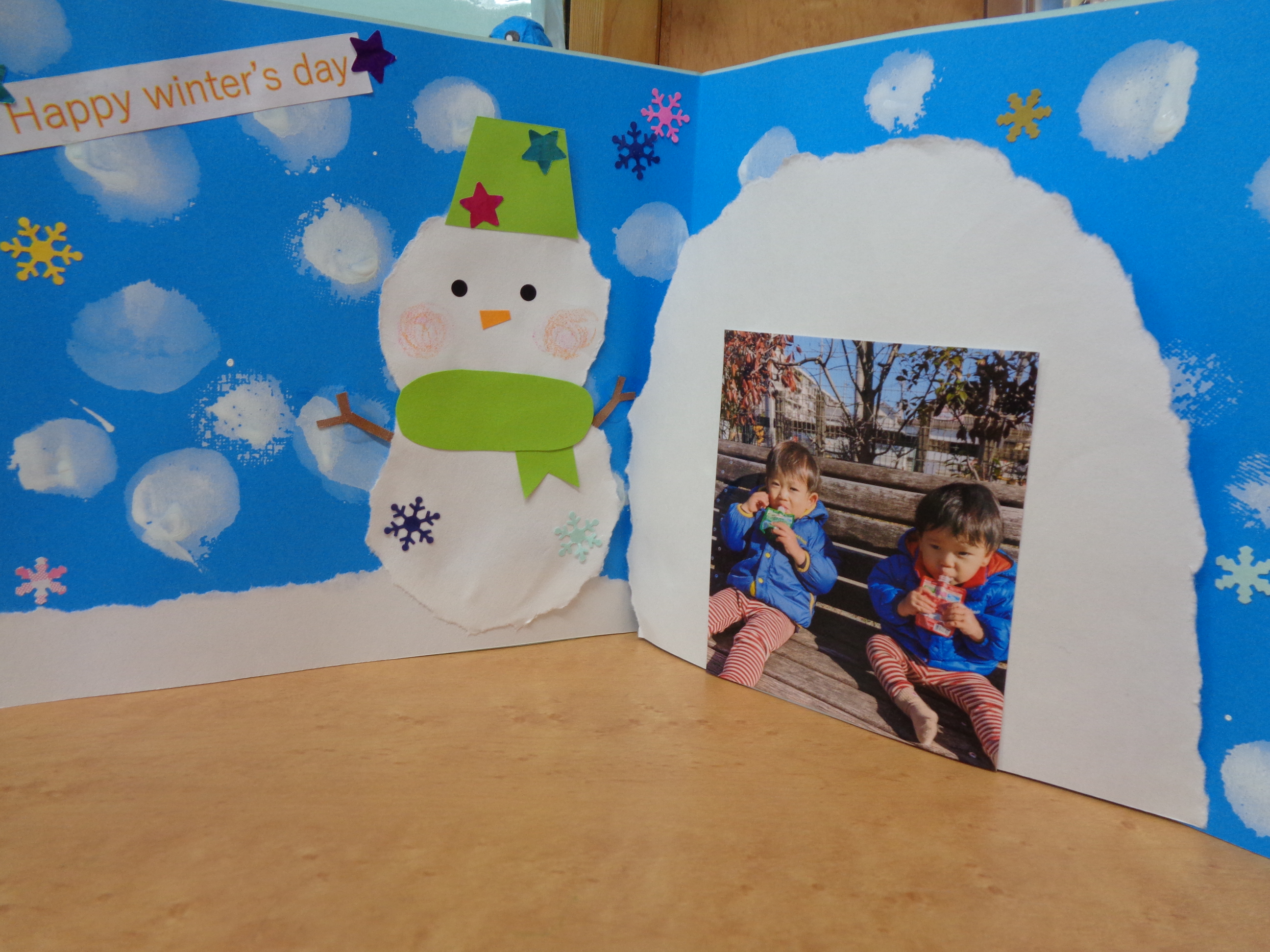 持ってきていただいた写真をかまくらの中に貼ってカードを作りました。