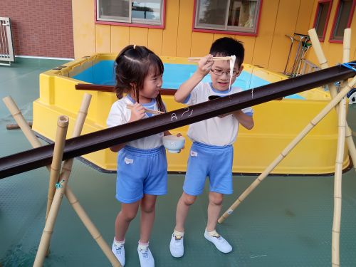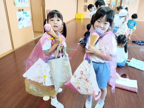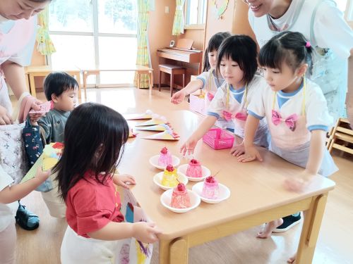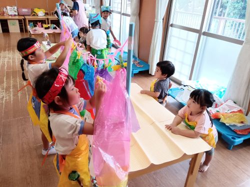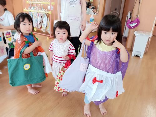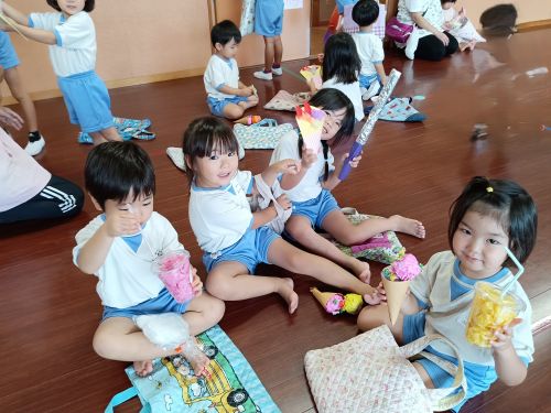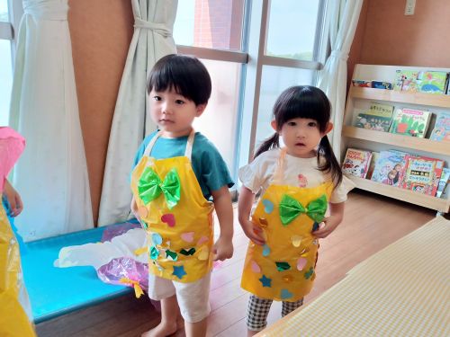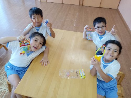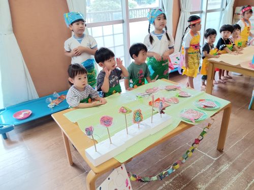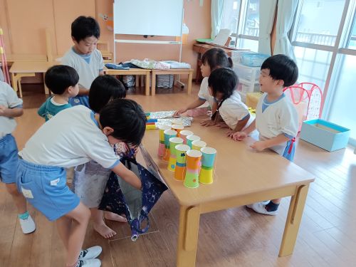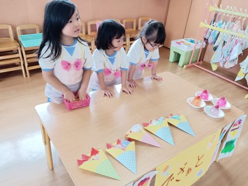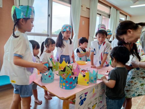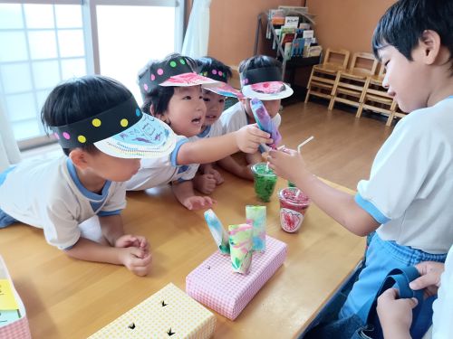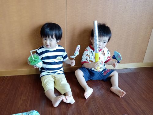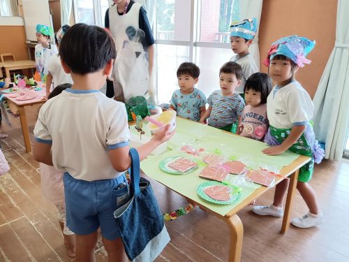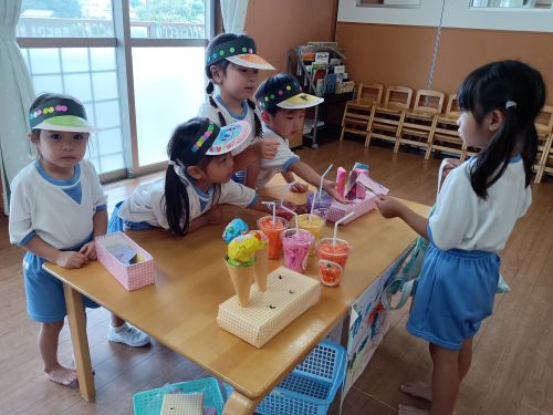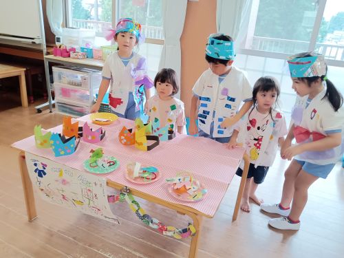 夏の暑い時期は外で遊ぶことができないため、室内で遊ぶ時間がどうしても長くなってしまいますが、その時間を使ってみんなでお店屋さんを作り上げていきました。