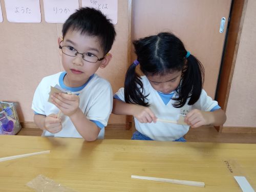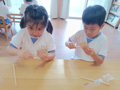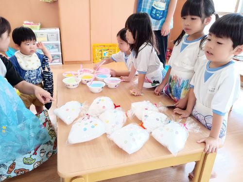 ひよこ・りす組は話し合いをすることはできませんが、商品作りには参加し、簡単な制作をするなど全クラスが参加してお店屋さんをつくっていきました。