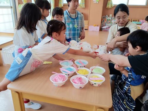 2色作ったものを混ぜ合わせている子もいれば、カップにふたのようにしてかぶせてみる子、どこまでも伸ばしてみる子、指輪にしてみる子などなど、みんな夢中で遊んでいました。