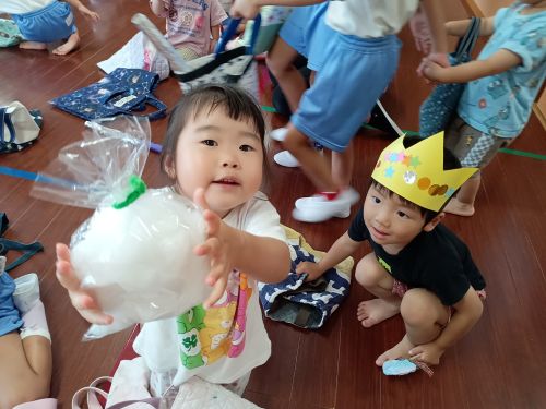 お店屋さんごっこ当日は、大きい子と小さい子とでペアになってお店屋さんになったり、一緒にお買い物に行ったりと異年齢での交流を楽しんでいました。