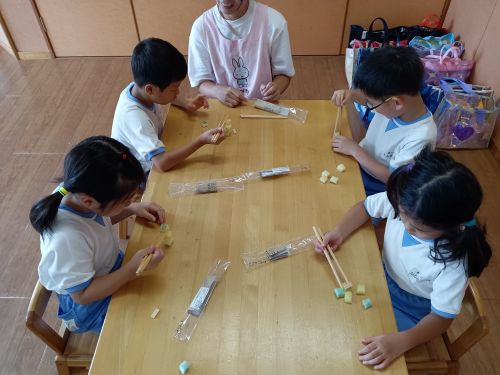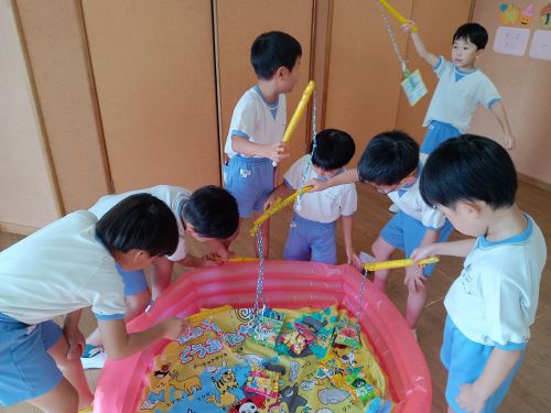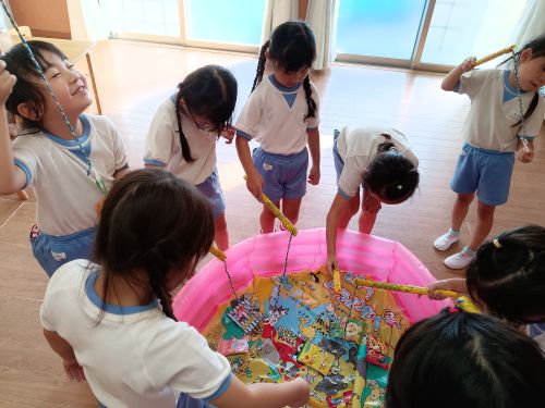 午後のおやつタイムでは、お菓子釣りをして自分で釣れたお菓子を食べました。