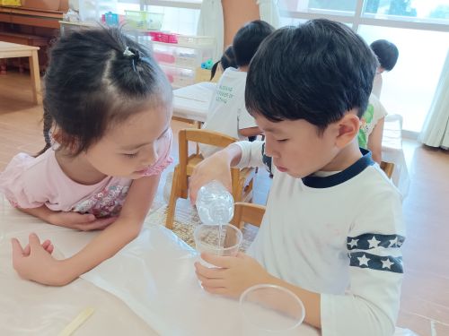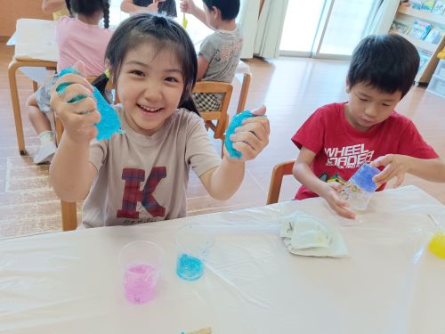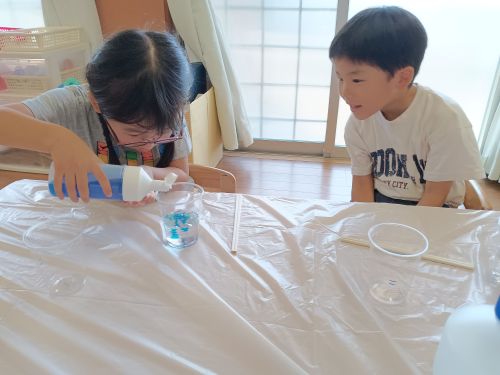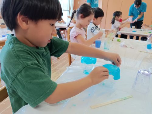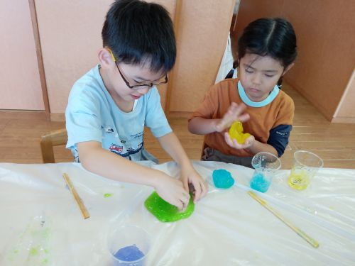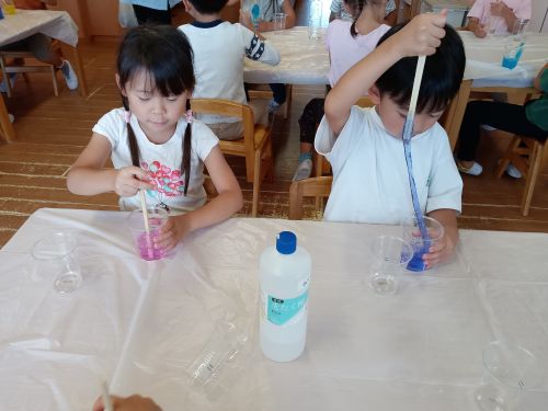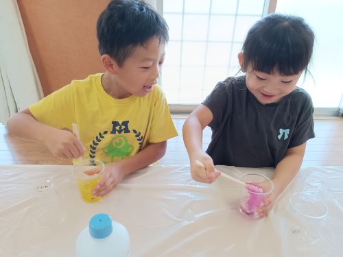スライム作りでは、自分で溶剤をカップに入れたり、好きな色を入れて作りました。