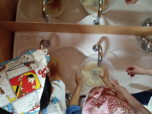 「お水が白くなった!」と驚いていたり、お米が逃げないように慎重に水を流したりしていました。