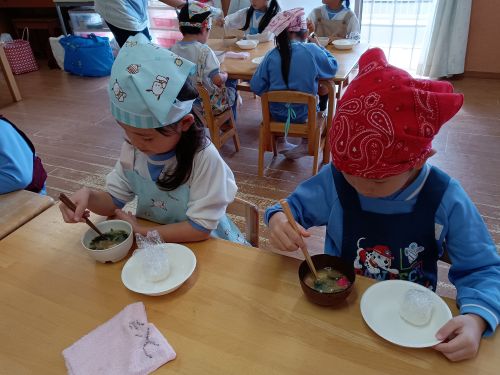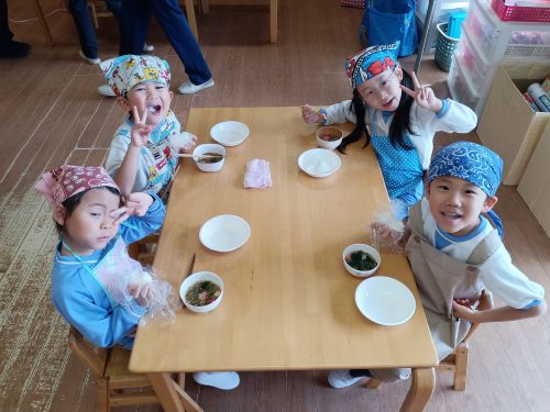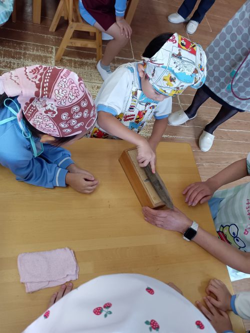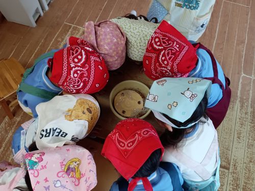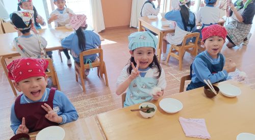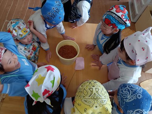 お味噌汁の味噌は、4月にみんなで作ったもので、味噌の出来上がりを楽しみにしていた子ども達。