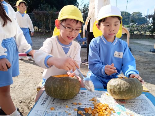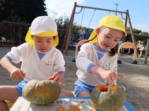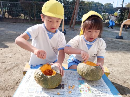 中身をくりぬいてからは、ランタンの顔をどのような顔にするか子どもたちが考えデザインし、できあがったかぼちゃのランタンは保育園の玄関に飾りました。