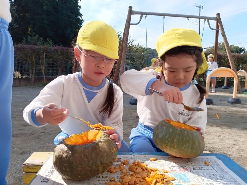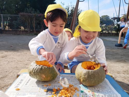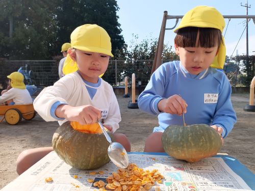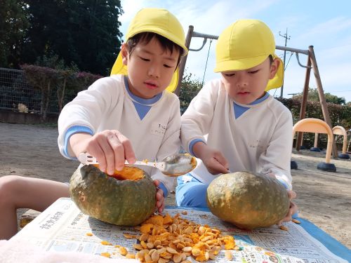 「かぼちゃってこんなに種がいっぱいあるんだー!」