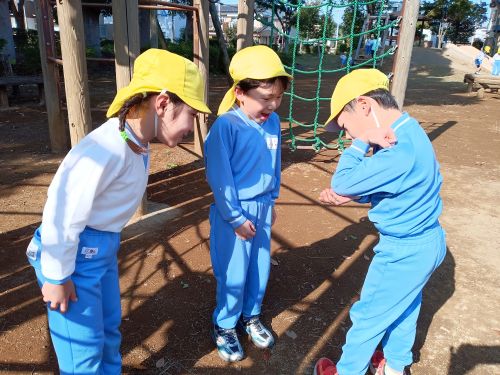 枯れ枝を集めて、たき火ごっこをしている子たちもいました。