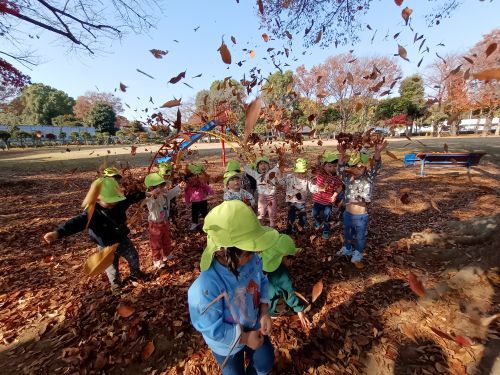 また、落ち葉がたくさんあったので葉っぱ遊びをしたり、きれいな葉っぱをおみやげに持って帰ってきたりもしました。