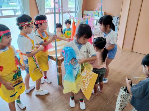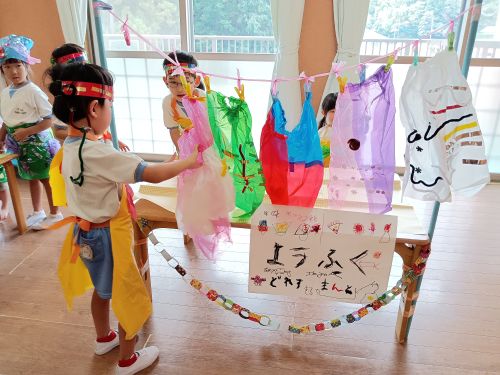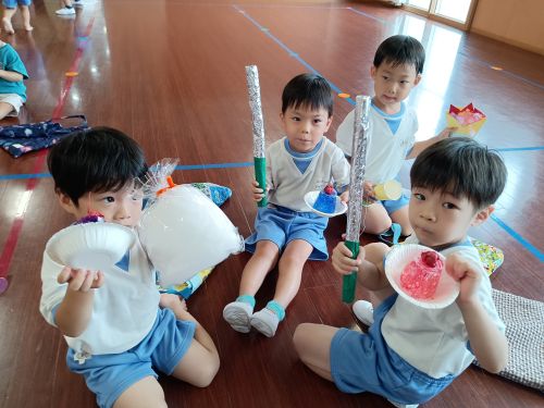 夏の暑い時期は外で遊ぶことができないため、室内で遊ぶ時間がどうしても長くなってしまいますが、その時間を使ってみんなでお店屋さんを作り上げていきました。