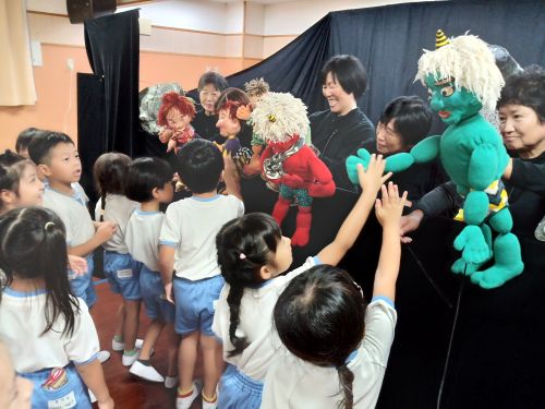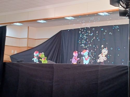 人形劇公演は人形劇だけでなく、手遊び歌やエプロンシアター、音楽に合わせて人形たちが出てくるモードビルという出し物など盛りだくさん!
